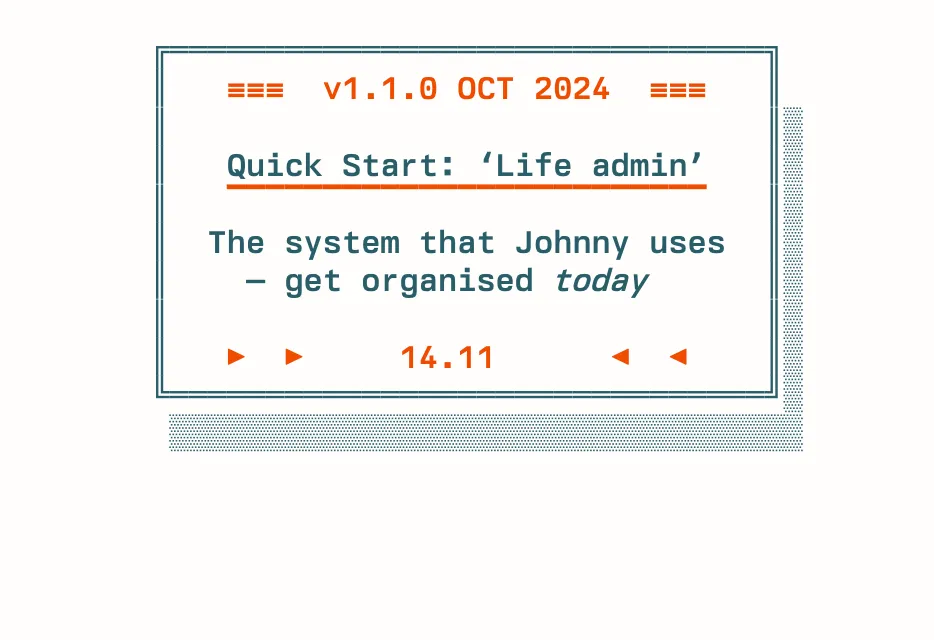 <pre class="upper astro-zkj6jvuo">╔═══════════════════════════════╗║<span class="orange astro-zkj6jvuo"> ≡≡≡ v1.1.0 OCT 2024 ≡≡≡ </span>║║ ║▒║ Quick Start: ‘Life admin’ ║▒║ <span class="orange astro-zkj6jvuo">▔▔▔▔▔▔▔▔▔▔▔▔▔▔▔▔▔▔▔▔▔▔▔▔▔</span> ║▒║ The system that Johnny uses ║▒║ — get organised <em class="astro-zkj6jvuo">today</em> ║▒║ ║▒║<span class="orange astro-zkj6jvuo"> ▶ ▶ 14.11 ◀ ◀ </span>║▒╚═══════════════════════════════╝▒ ▒▒▒▒▒▒▒▒▒▒▒▒▒▒▒▒▒▒▒▒▒▒▒▒▒▒▒▒▒▒▒▒▒ </pre>- ↑ code renders as:
